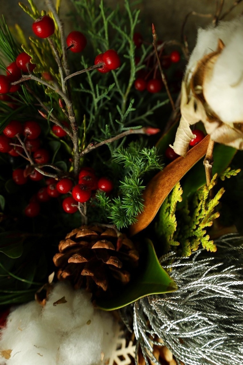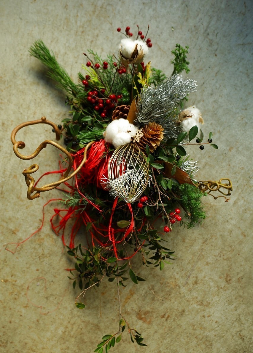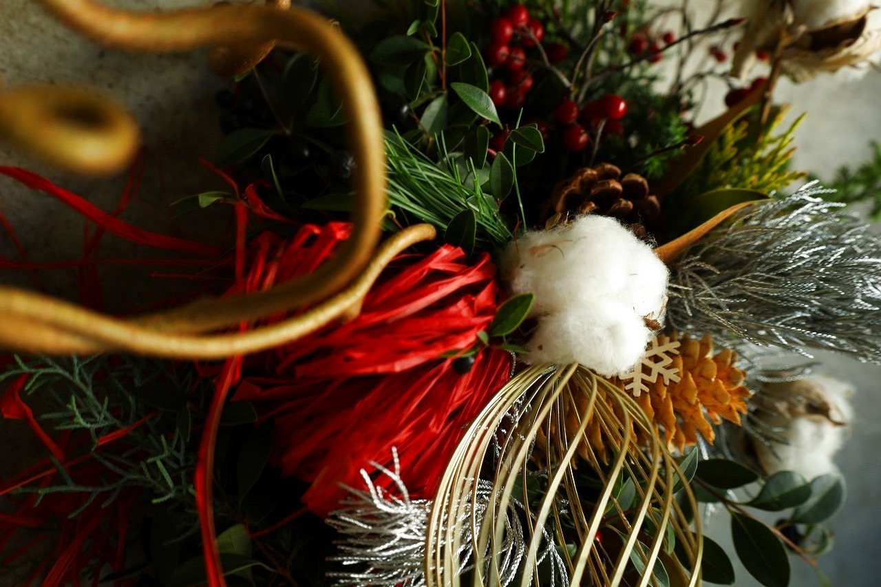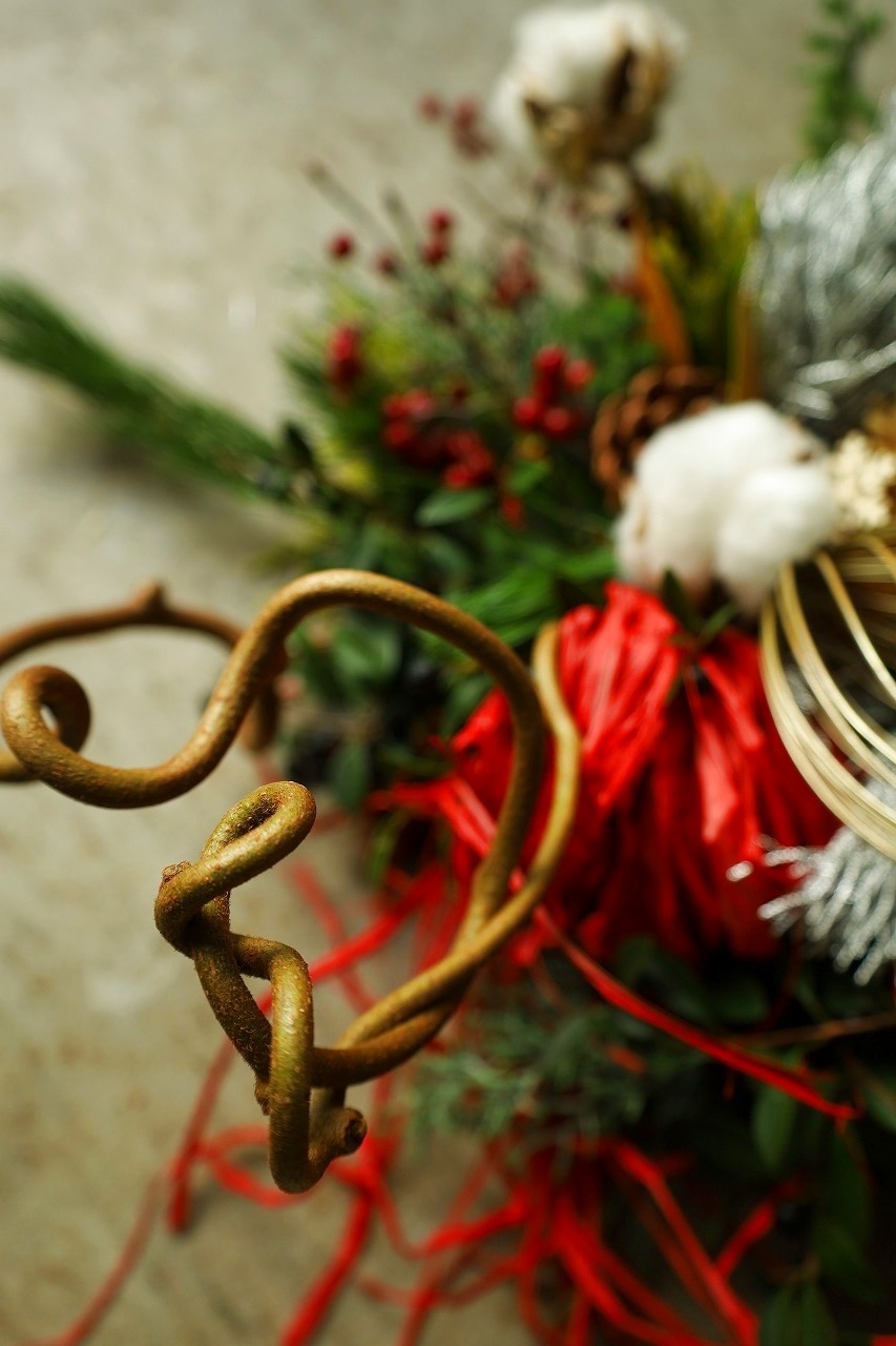 Christmasのモチーフをはずして、水引の鶴やちりめんに変えればお正月も飾っていただけます!
