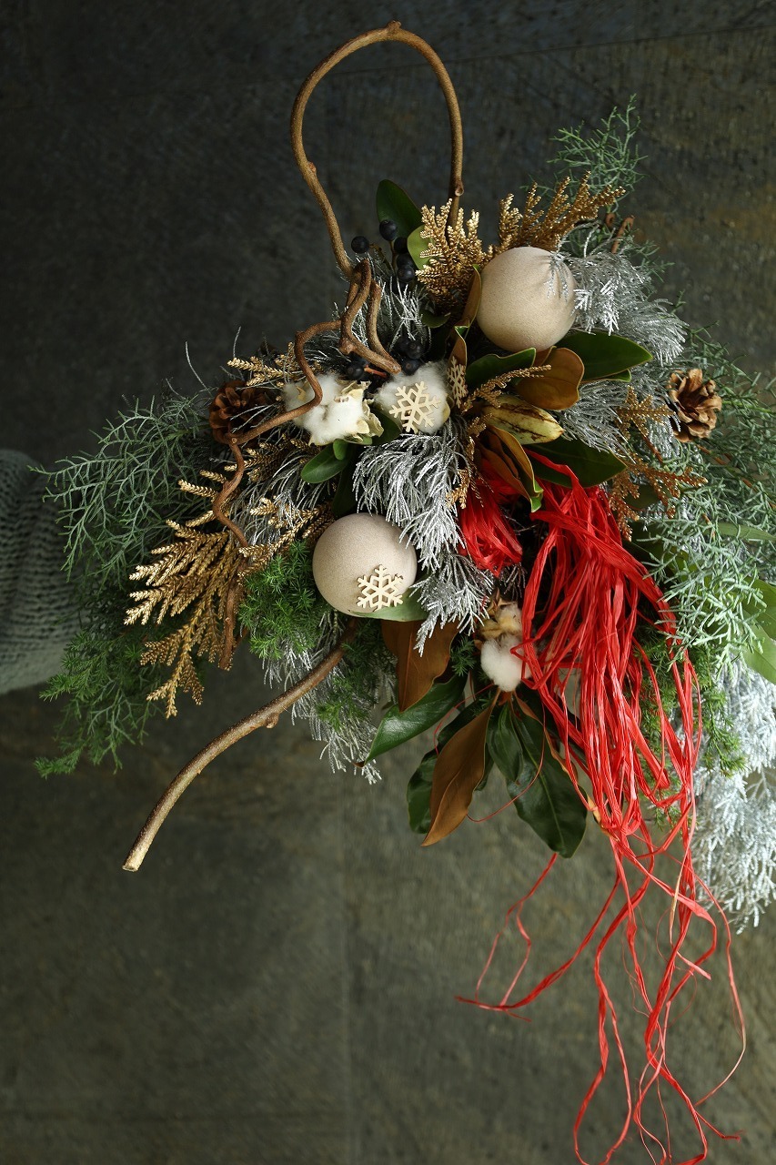 雪の結晶のモチーフをはずして、水引の鶴やちりめんに変えればお正月も飾っていただけます!
