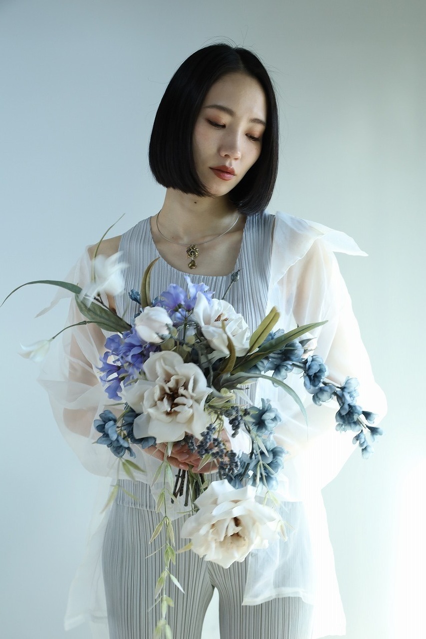 柔らかなベージュが肌をきれいに見せ、グレイの花影が全体を引き締めます。ラインはすっきり、ボリュームは上品に。スレンダーなウェディングドレスに合わせると、シルエットがより美しく映えます。