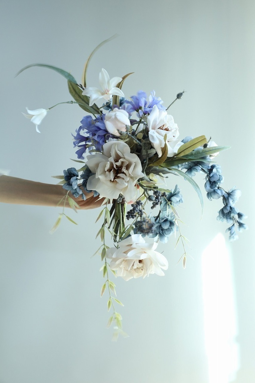 グレイッシュなデルフィニウムと、落ち着いたベージュのバラを主役に、色と質感の“間”を大切に束ねたウェディングブーケです。