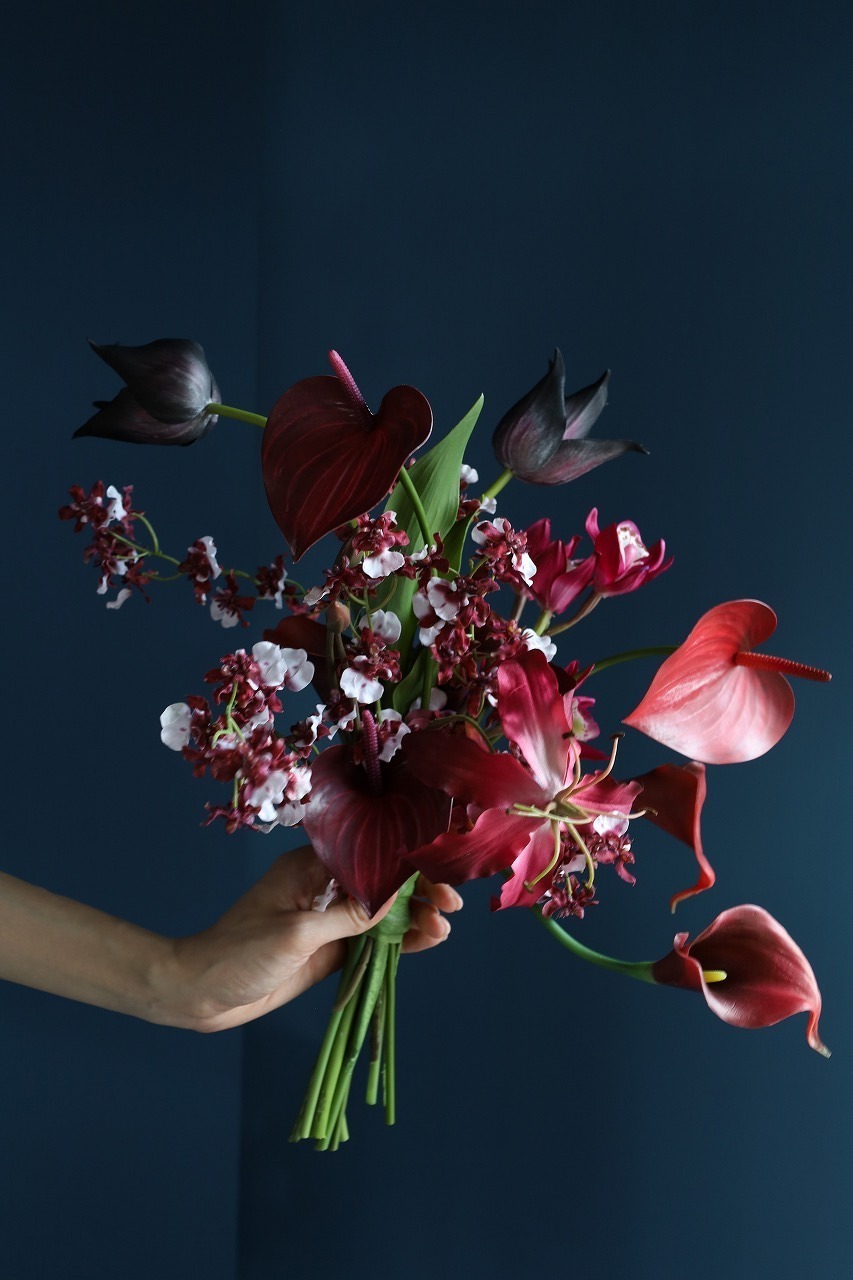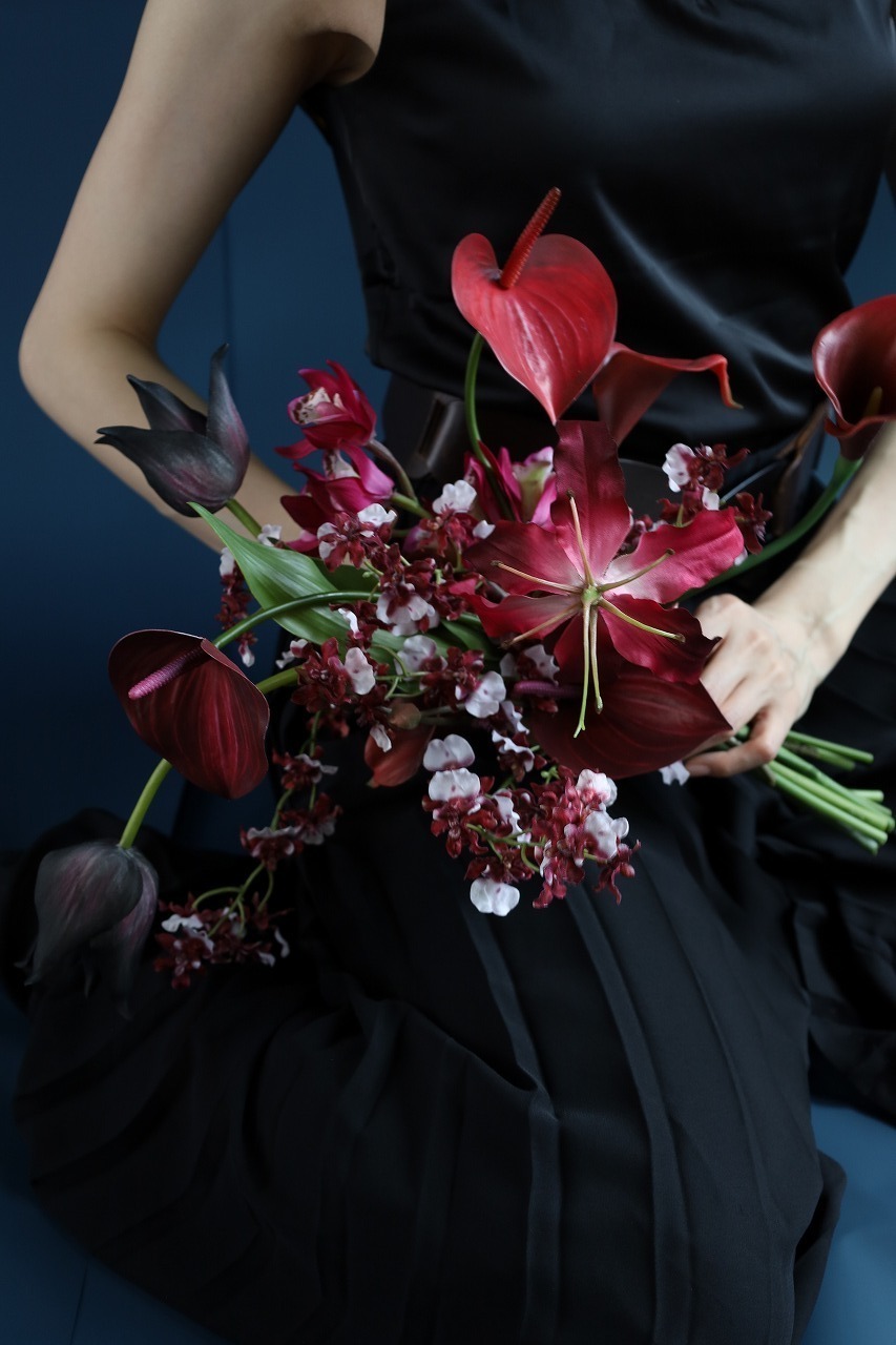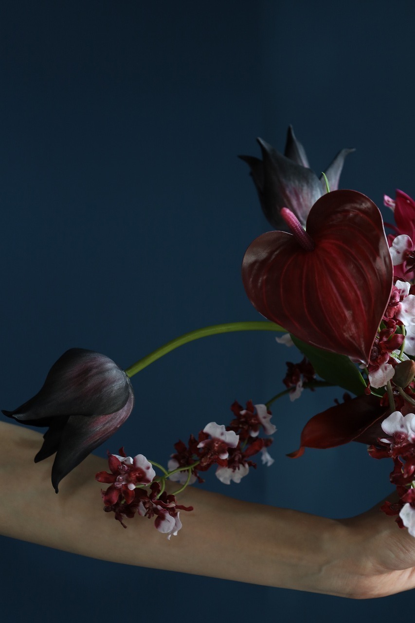 黒いチューリップを軸に、ワイン〜ボルドーの深みと赤の艶を重ね、空気が締まる配色にまとめました。