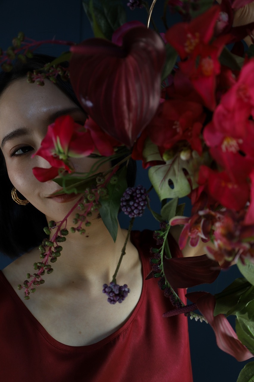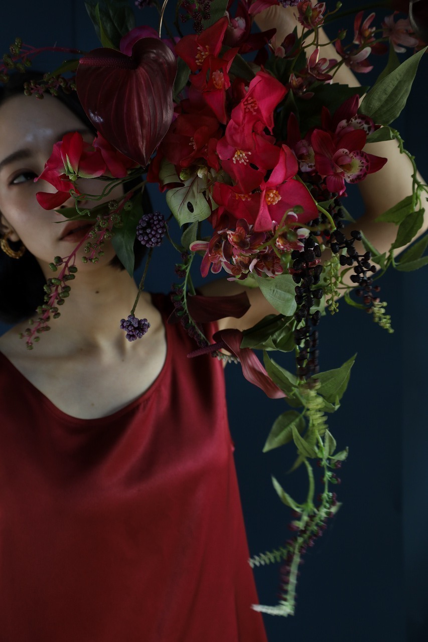 深い赤〜ボルドーを主役に、ブラックで陰影を足し、実ものと垂れるグリーンで奥行きを演出。