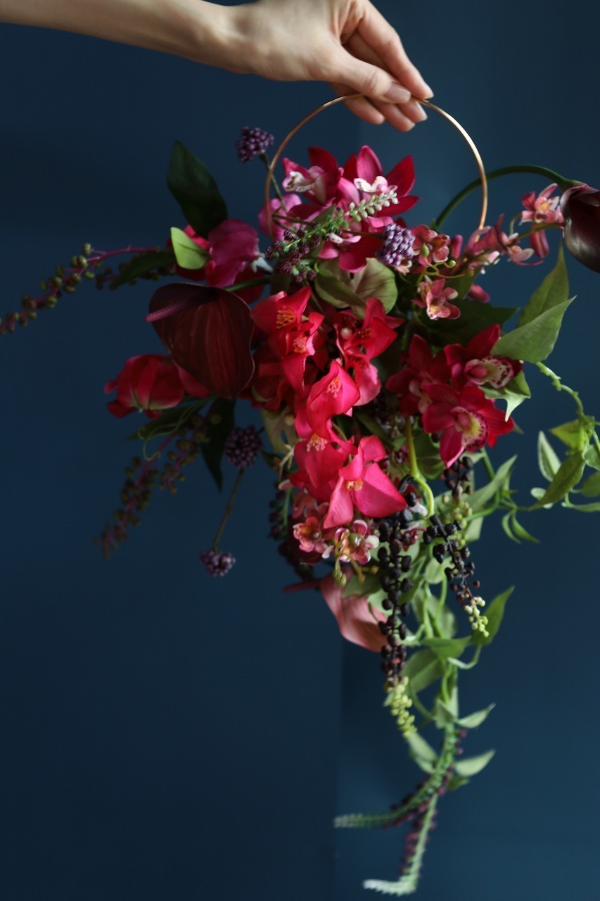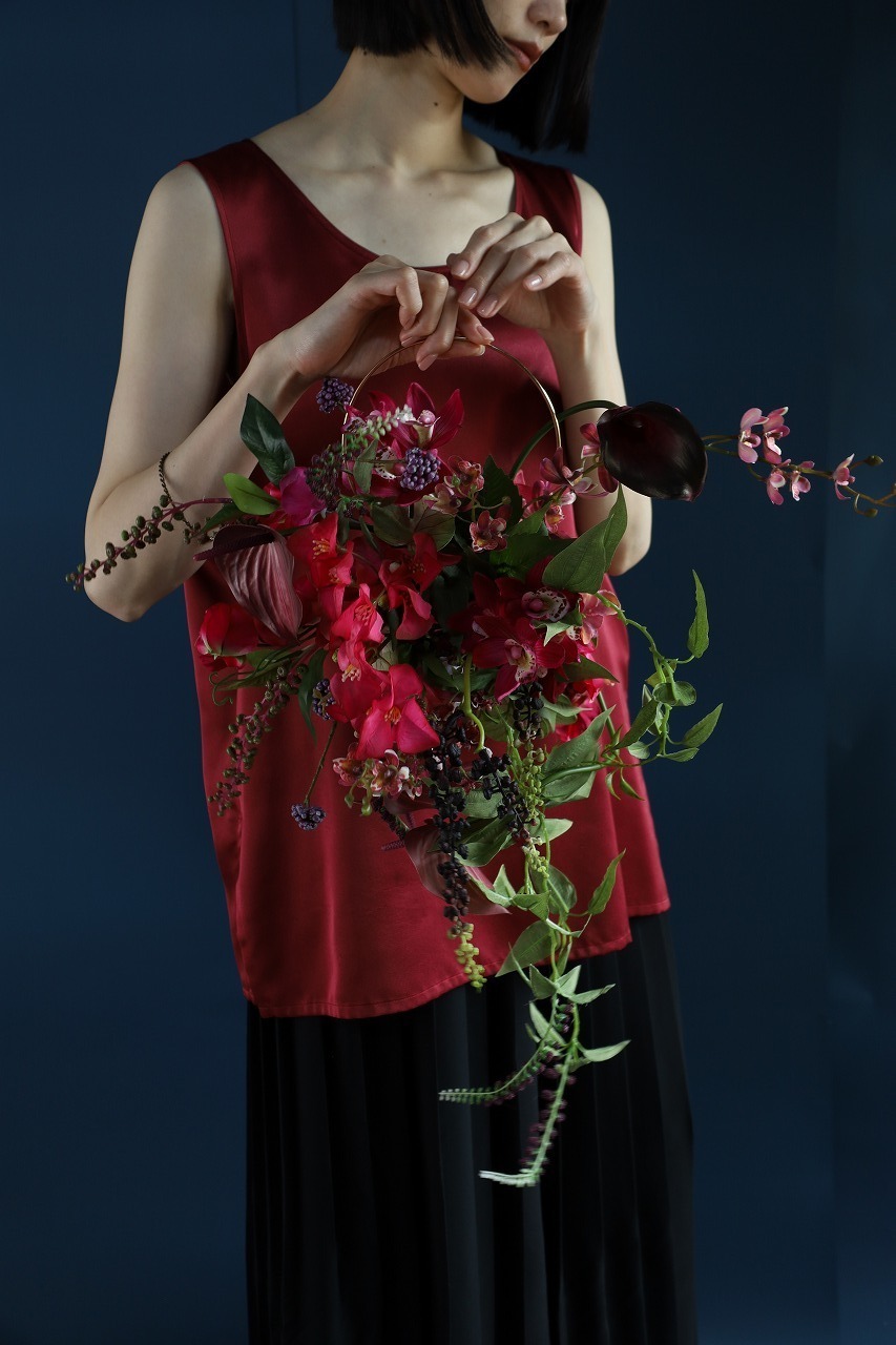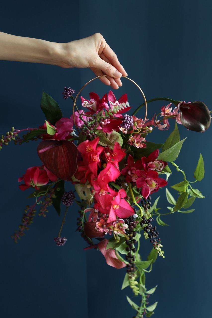 リングブーケ(フープブーケ)|和モダンな深紅のウェディングブーケ|造花a7