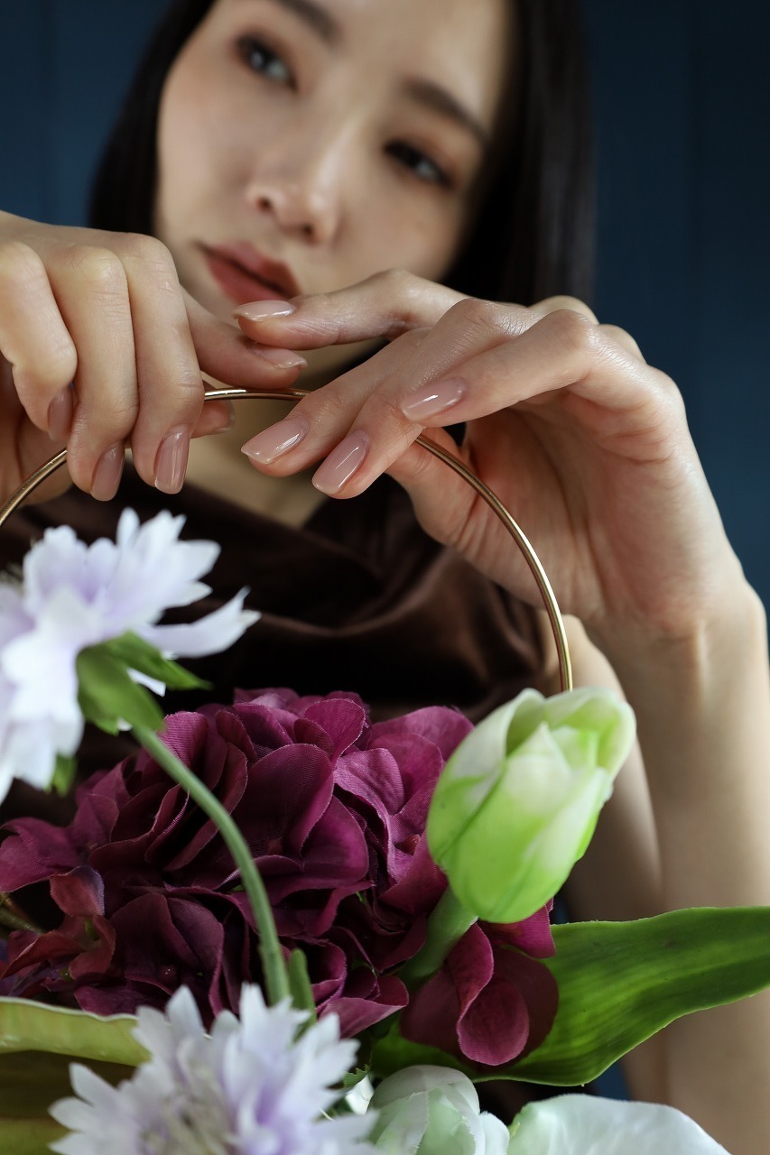 白花の清潔感に、深いボルドーで奥行きを足し、差し色のライラックが静かに抜けます。