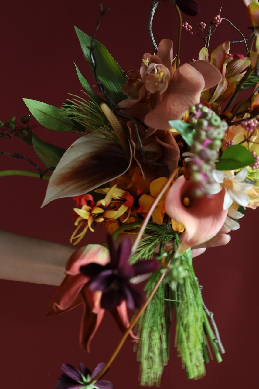 ガーデンボタニカル|オレンジ×プラム×ディープパープルのアーティフィシャルフラワーブーケa11