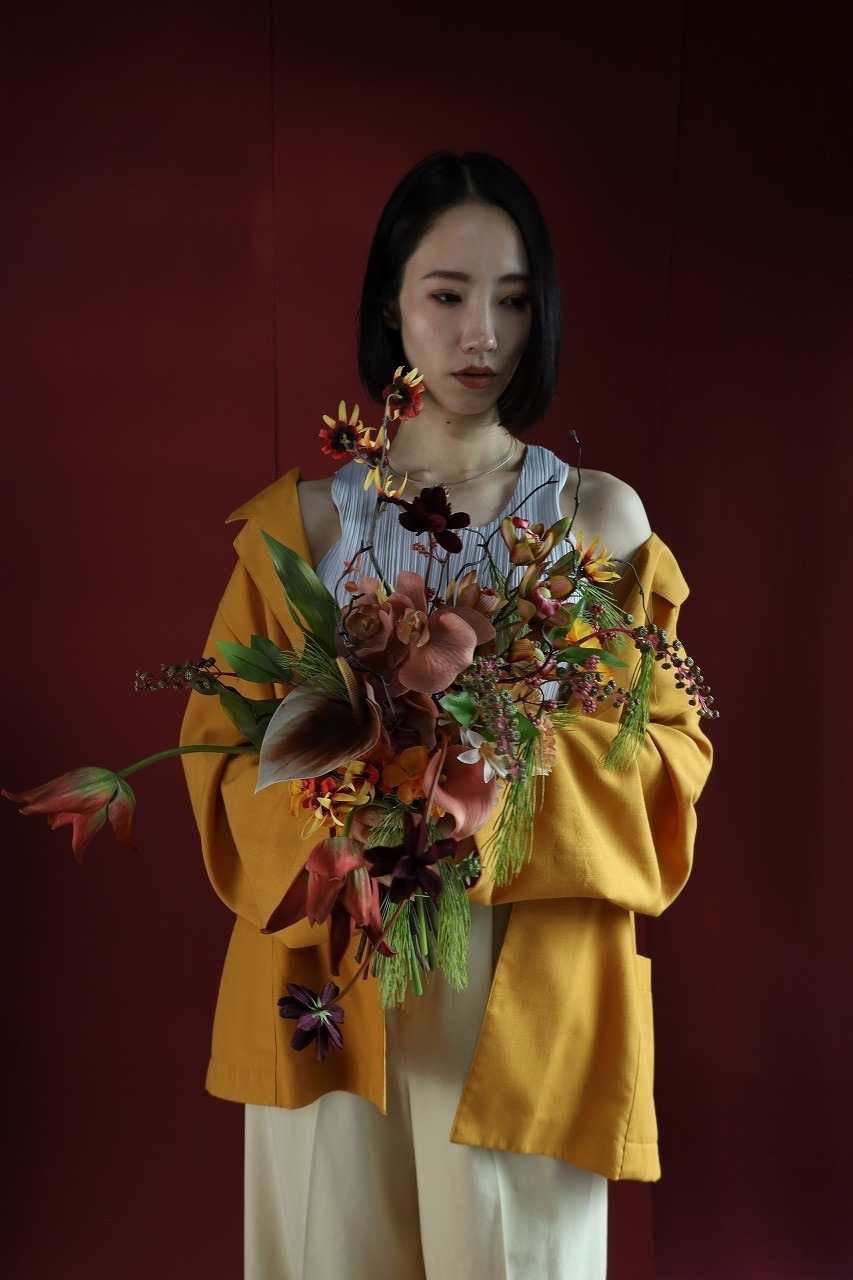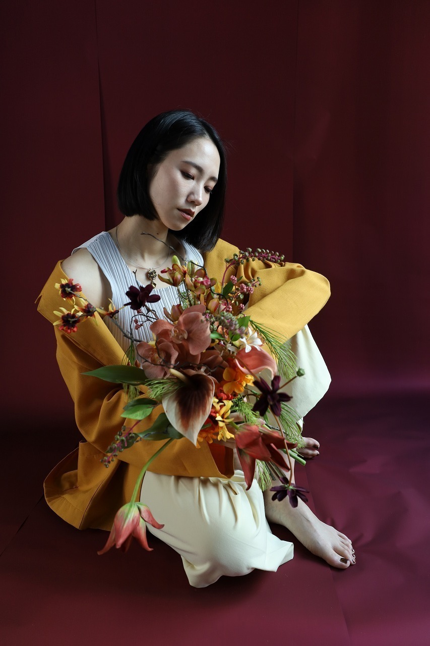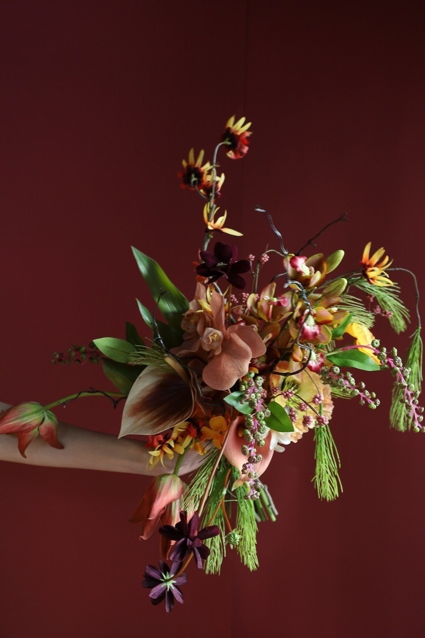 オレンジのポピーや深いプラム、ディープパープルを重ねて、**“華やかだけど大人”**のバランスに仕上げた一点もの。