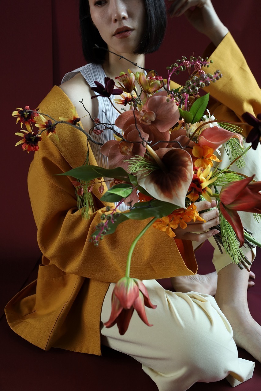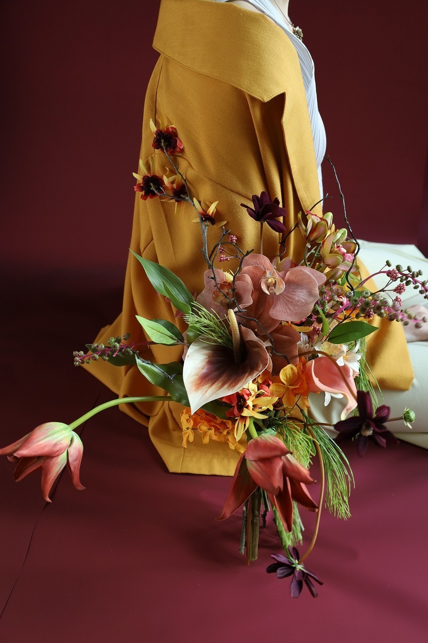 白ドレスはもちろん、ブラウンやテラコッタのドレスにも相性◎。和の小物や深い色味の装いにも寄り添う、エディトリアルなブーケです。