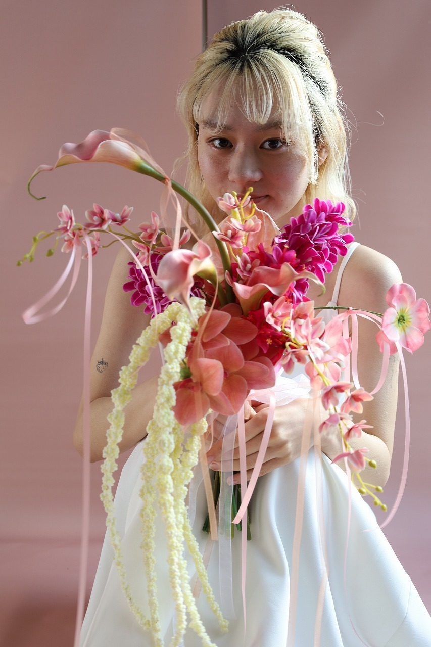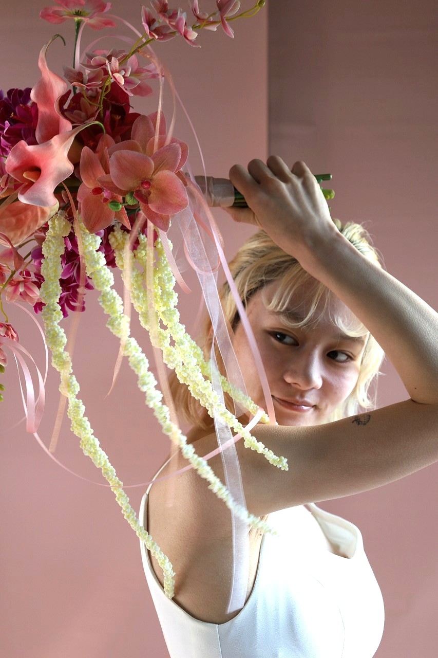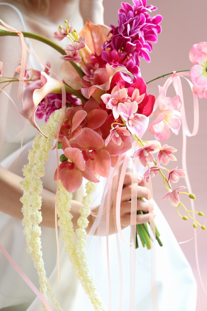 前撮りに映える|ビビット×ニュアンスピンクのカスケードブーケb3