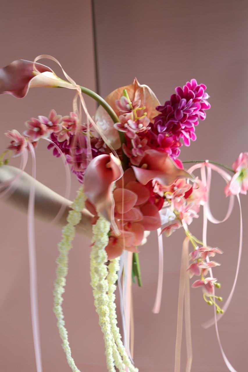 胡蝶蘭の上質な白、シックなカラーとアンスリウムの艶、アマランサスの流れ、ヒアシンスの繊細さを重ねて「大人の華やかさ」に寄せました。