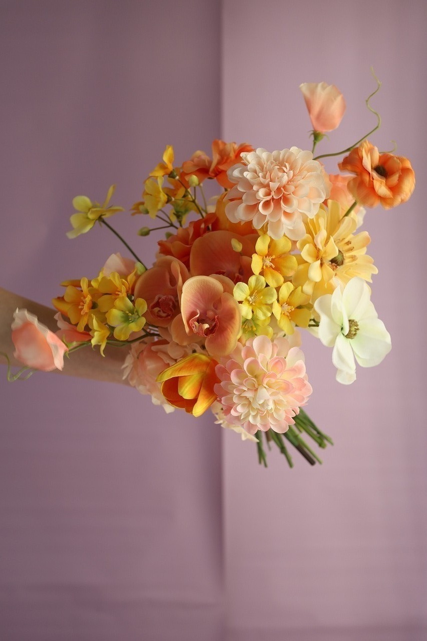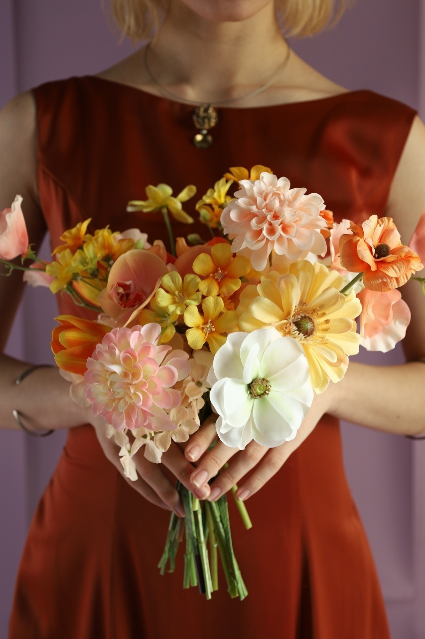 オレンジやイエロー、アプリコットの花々を重ねた、明るく柔らかな印象のカラーブーケ。